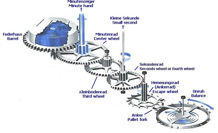 Die Antrieb für das Räderwerk kommt vom Federhaus. Der Gangregler, die Unruh, befindet sich am anderen Ende dieser Kette.