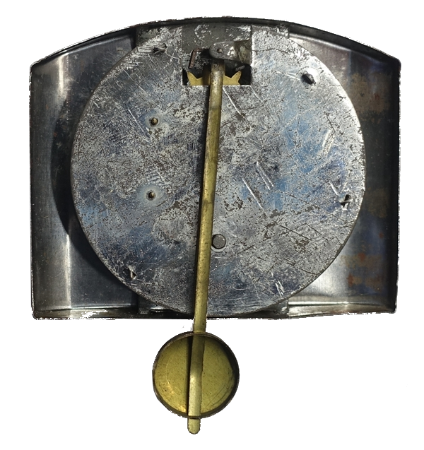 Die kleine Uhr mit der Aufschrift LUSO-BABY misst gerade einmal 49 x 60 x 16 mm ohne Pendel und Zeiger.
